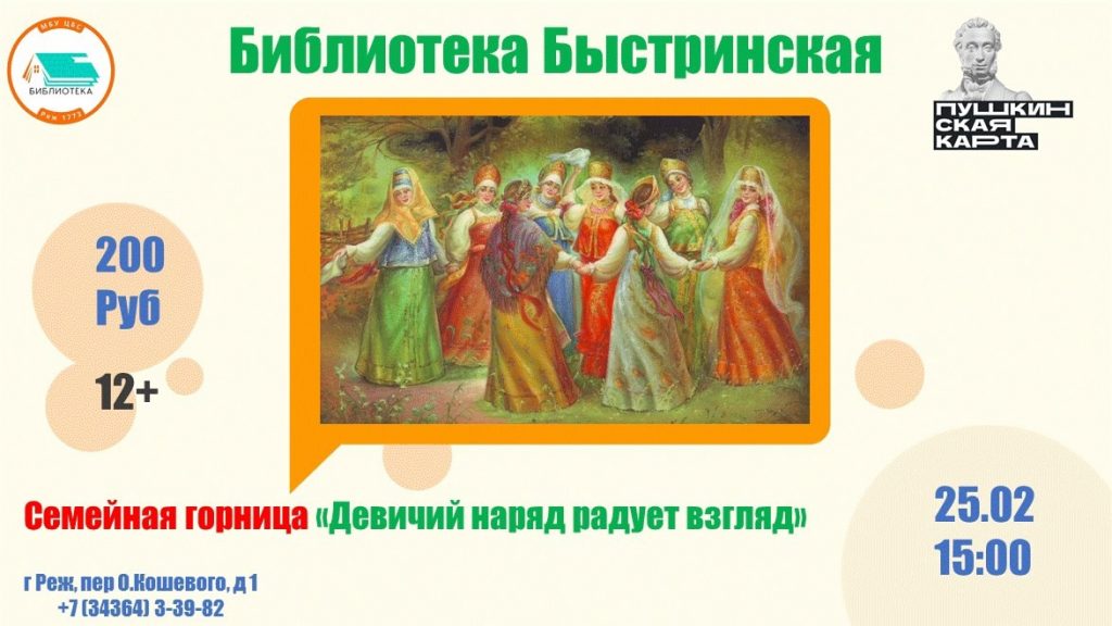 25 февраля 2025 в 15:00 200 руб. 12+ Библиотека «Быстринская»