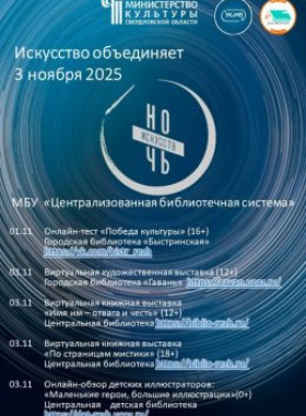 С 3 по 4 ноября 2025 года в Свердловской области проходит ежегодная всероссийская акция «Ночь искусств – 2025». Акция приурочена к празднованию Дня народного единства и проходит под девизом «Искусство объединяет».