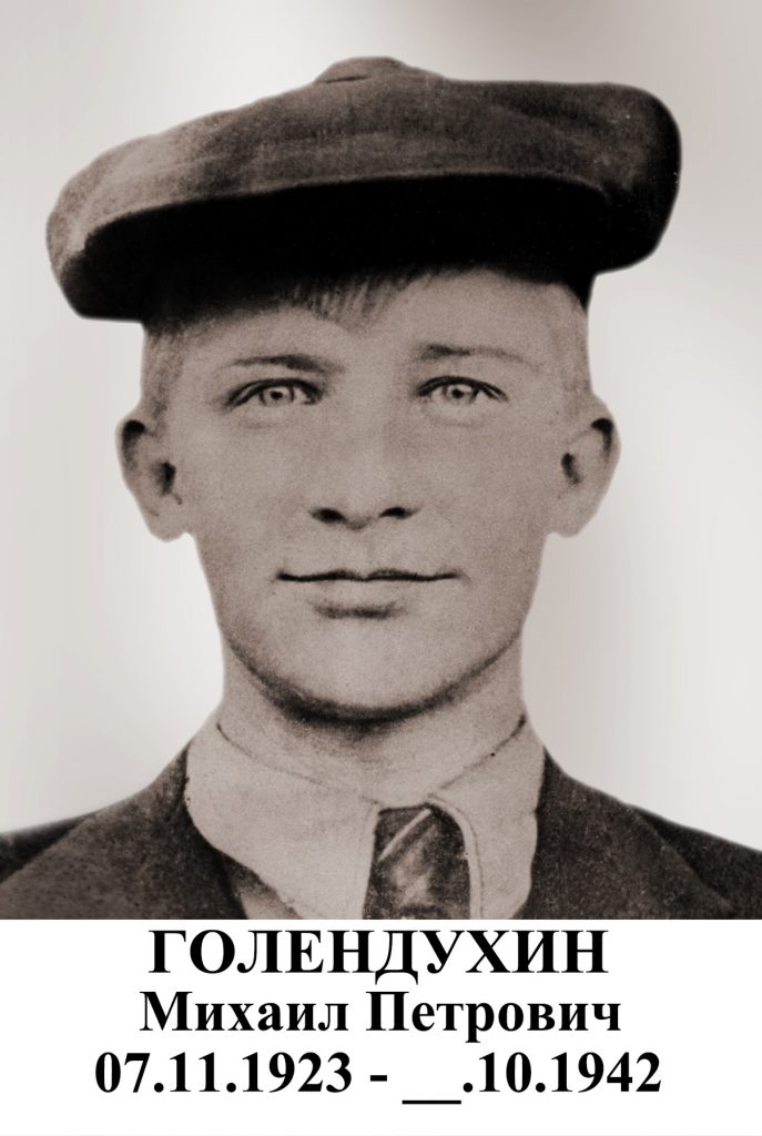 Родился в 1923. Родился в д. Голендухино 7 ноября 1923 года. Окончил школу 7 классов и Сысертскую школу овощеводов. 16 октября 1941 года добровольцем ушёл на фронт. Прошёл обучение в г. Котельнич и г. Электросталь. Воевал в 40 гвардейской стрелковой дивизии. Пропал без вести под г. Сталинградом в октябре 1942 года. Рядовой. Последнее место службы 111 ГВ с п. Дата и причина гибели неизвестна (По словам сослуживца: Михаил с группой добровольцев ушли навстречу немецким танкам и не один из них не вернулся.) Извещение о без вести пропавшем семья получила в марте 1948 года. Брат Голендухин Юрий Петрович проживает в д. Голендухино