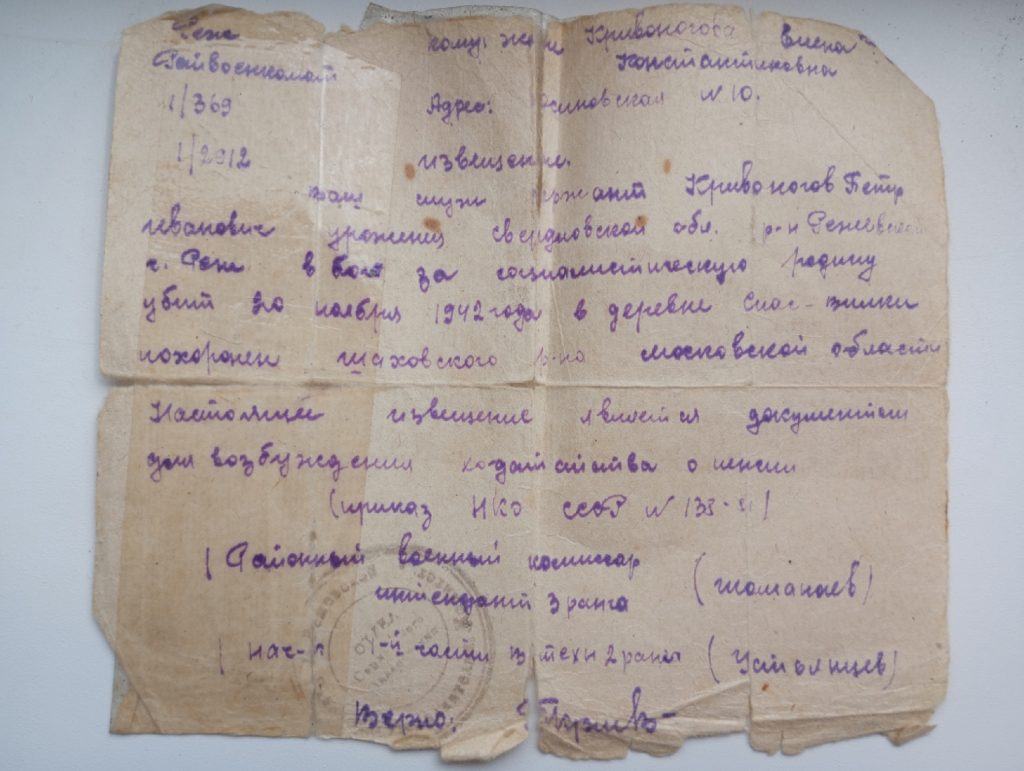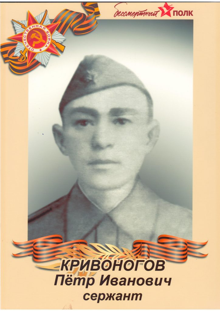 / Книга памяти / Реж / Гавань / Кривоногов Пётр Иванович Кривоногов Пётр Иванович Сержант Кривоногов Пётр Иванович уроженец Свердловской области, Режевского района, г.Реж убит 20 ноября 1942 года в деревне Спас-Вилки Шаховского района Московской области.