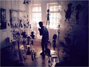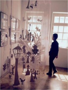 Например, создание интересной предметной среды вокруг книги. Привычная форма представления книги сводится к выставке из книжных обложек и иллюстраций. А новый творческий подход предполагает создание совершенно иной атмосферы общения, чем-то похожей на театральную. Театральная декорация обладает особым свойством: она вызывает ожидание начала действия. Это не просто интерьер. Это место, где что-то должно случиться. В том числе – и с тобой.