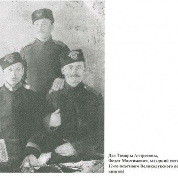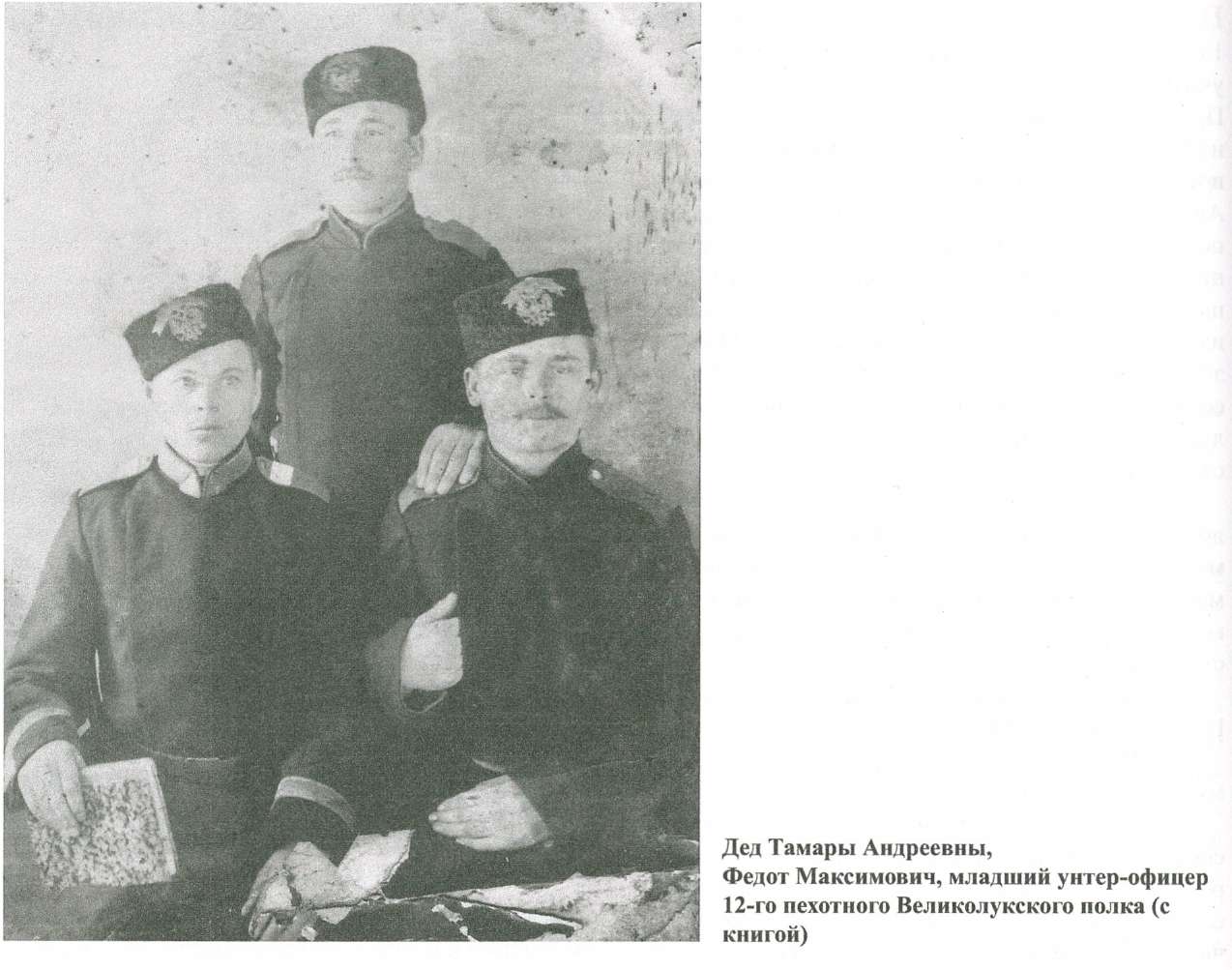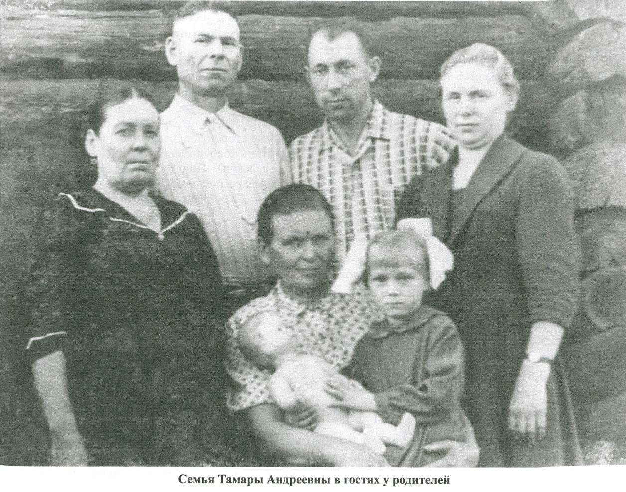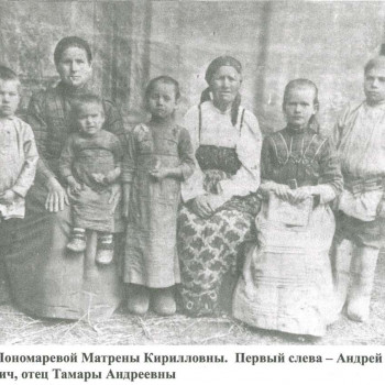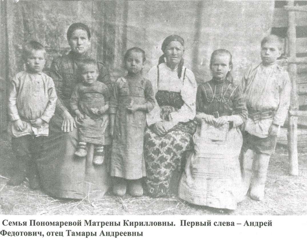 Отец Тамары Андреевны – Пономарев Андрей Федотович 1909 года рождения. Родители Андрея Федотовича: бабушка Тамары Андреевны – Поно­марева Матрена Корниловна родилась 24.03.1875 года, дедушка – Пономарев Федот Максимович, младший унтер-офицер 12 пехотного Великолукского полка, родился в 1876 году, служил в царской армии, относится к династии Пономаревых. (2). В семье родилось пятеро детей. Старший Федор по­гиб молодым под колесами поезда на станции Егор­шино. Мария жила в Киргизии, Александра в рабо­чем поселке на станции Егоршино.