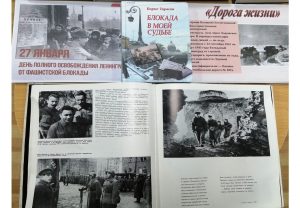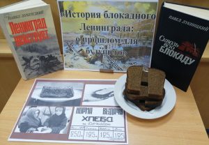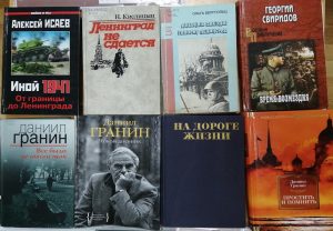 В книгах, представленных на выставке, рассказывается о беспримерном подвиге осажденного фашистами Ленинграда, о мужестве и героизме его жителей, сумевших выстоять в нечеловеческих условиях блокады, переживших страшный голод, страдания, смерть близких: «О подвиге твоём Ленинград», «На дороге жизни: воспоминания о фронтовой Ладоге», Кислицин Н «Ленинград не сдаётся», Гранин Д. «Простить и помнить», Чижова Е. «Город, написанный по памяти», Тарасов Б «Блокада в моей судьбе» и др.