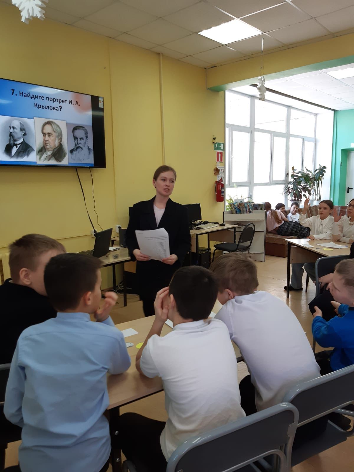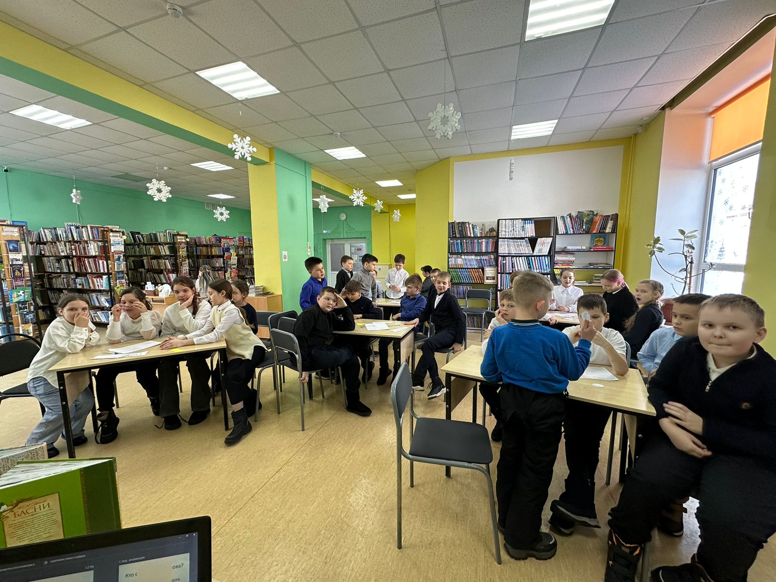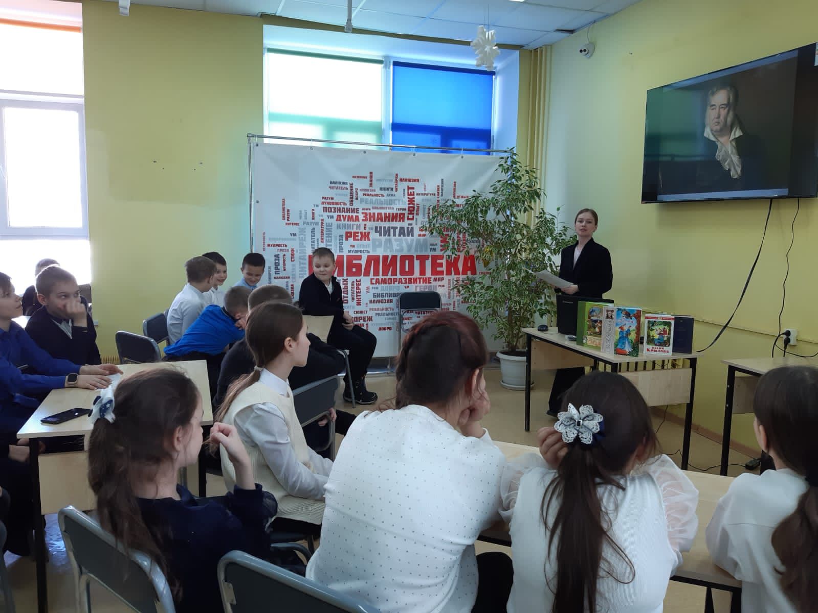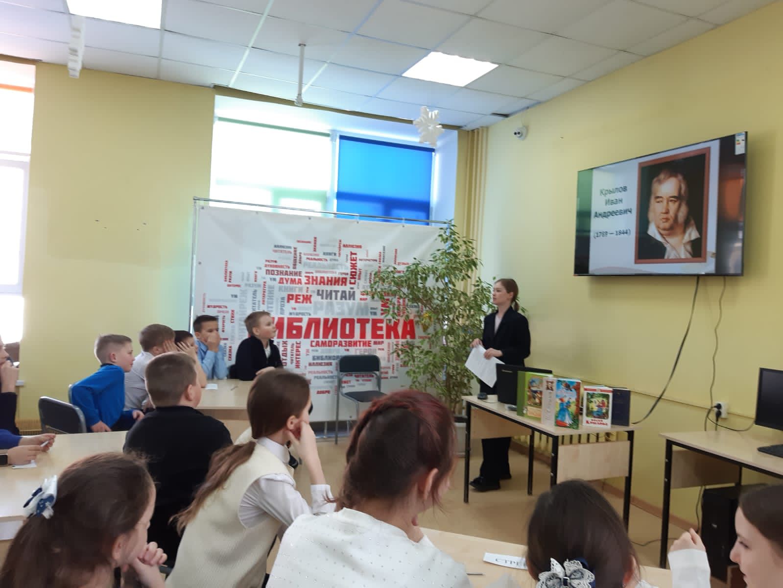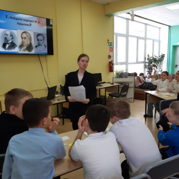 В этом году, 2 февраля, знаменитому русскому писателю и драматургу Ивану Крылову исполнилось бы 255 лет. В честь этого, для ребят 4А класса школы №2 была проведена интерактивная игра «В мире басен». Дети перемещались на разные станции. На библиографической станции, библиотекарем были рассказаны самые ключевые моменты из жизни баснописца. На следующей станции дети разгадывали кроссворд, расшифровывали имена героев и находили «пару». Например, Стрекоза-Муравей, Обезьяна-зеркало и т. д. И наконец, на «итоговой» станции мы смогли определить команду, которая победила. Команды читали басни Крылова с выражением.