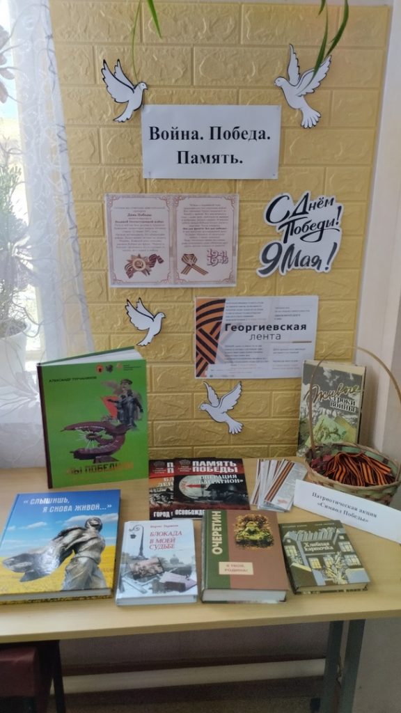 В рамках акции для читателей в библиотеке была оформлена книжная выставка «Война. Победа. Память». Представленные на выставке книги помогают подробнее узнать о Великой Отечественной войне, глубже понять прошлое своей страны и её роль в мировой истории. Каждому участнику подарили символ победы и закладку для книг.