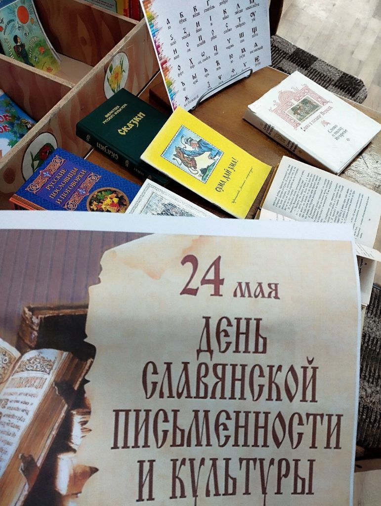 - на детском абонементе информационно-познавательный блок «Истоки русской письменности», где читатели и посетители прослушали историю зарождения русской письменности и смотрели, и пробовали прочесть книги, в которых встречаются тексты, написанные на древнерусском языке – «Древнерусская литература» и «Слово о полку Игореве». После, по желанию, читали книги содержащие русские народные пословицы, поговорки, потешки, песни.