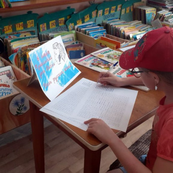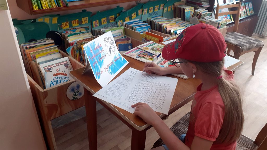 Еще одной локацией, которую дети посетили 6 июня, стало мероприятие «День русского языка», который отмечается в один день с Днём рождения А.С. Пушкина. Поэт одним из первых начал использовать в своих произведениях простой русский язык, избавив его от излишней вычурности и вставок иностранных фраз, тем самым заложив основы русского литературного языка. Поэтому для расширения кругозора наши читатели и посетители познакомились со словарями русского языка, дали расшифровку фразеологизмов и крылатых выражений, решили филворд «Русский язык вчера и сегодня», ответили на вопросы викторины «Молодежный сленг» и угадали скрытый смысл русских народных пословиц и поговорок.