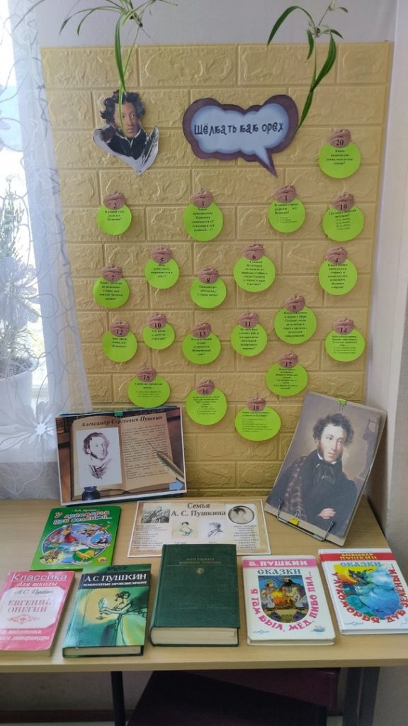 Ежегодно 6 июня в России отмечается Пушкинский день. Для посетителей Голендухинской сельской библиотеки к этому дню была оформлена Выставка-викторина «Щёлкать как орех». На которой были представлены книги А.С. Пушкина, а также информация из биографии писателя. Каждый участник выбирал любой орешек и «щёлкал» его, отвечая на вопросы выставки.