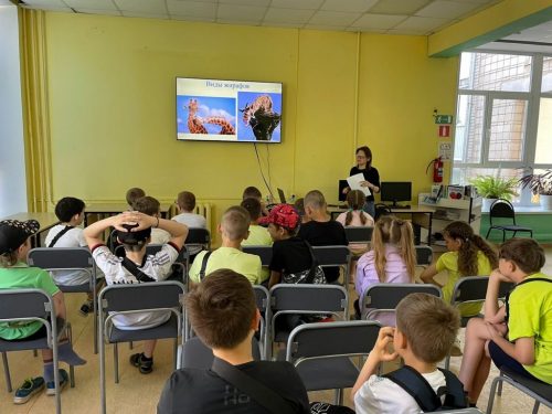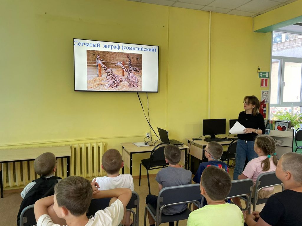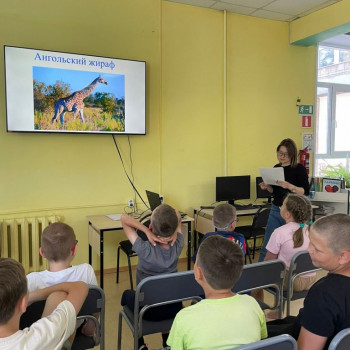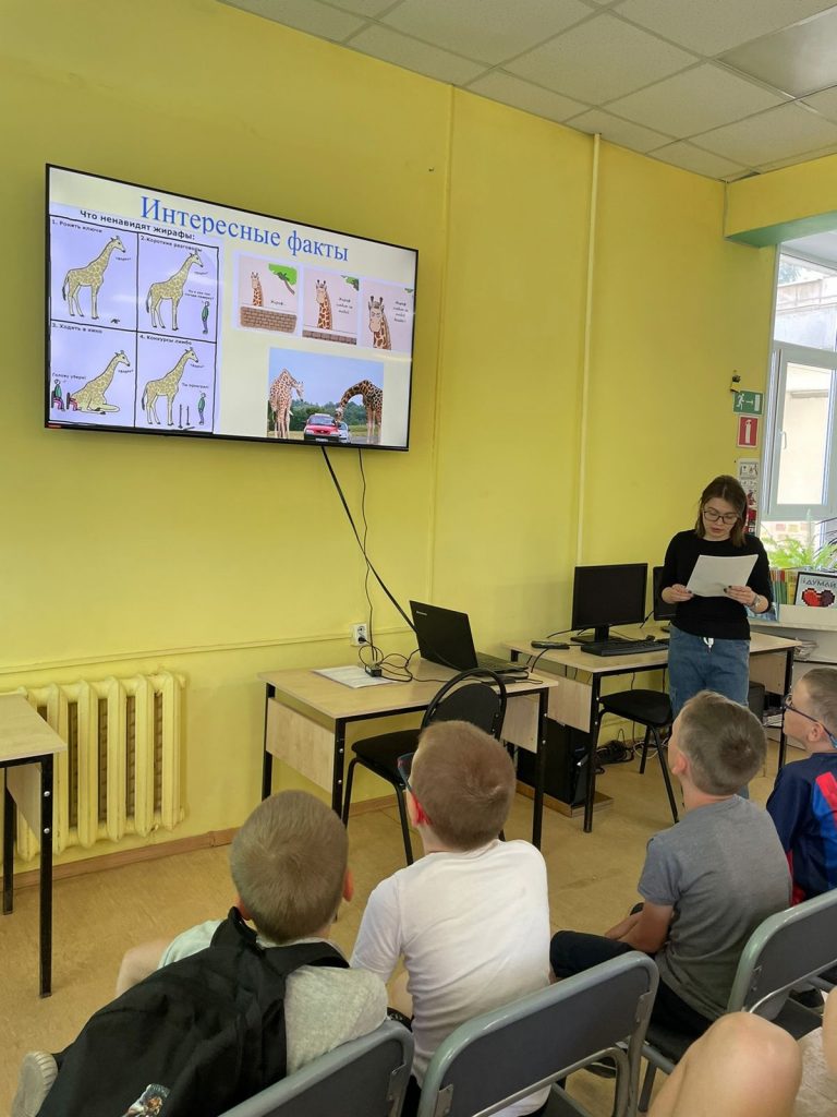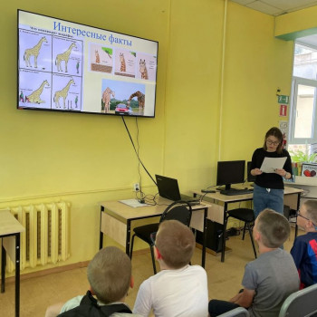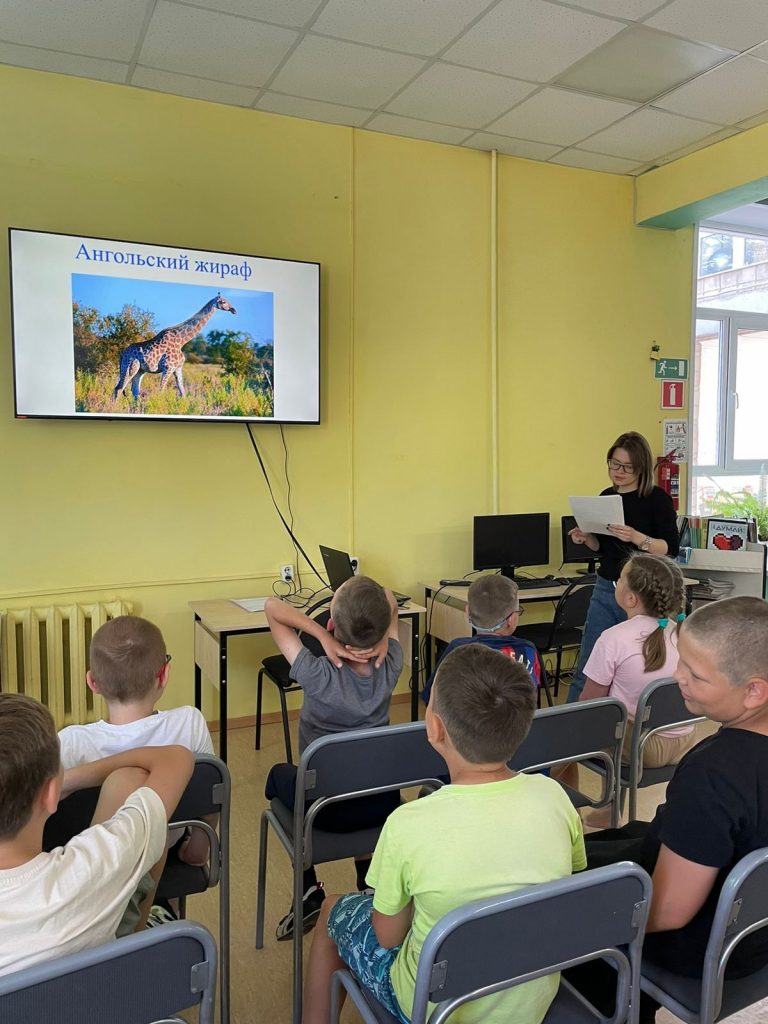 Ребята узнали о различных видах жирафов, интересных фактах об их жизни, а также о том, как жирафы спят, где обитают и чем питаются. Библиотекарь рассказала, что название «жираф» происходит от арабского слова «зарифа», означающего «нарядный».