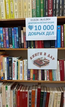 К участию в областной акции «10 000 добрых дел в один день» присоединились жители нашего города. Участниками акции стали более 50 человек от 20 до 77 лет. В Центральной библиотеке на выставке «Книги в дар» экспонировалось более 300 книг по разным отраслям знаний. С выставки книголюбы выбрали для себя более 200 книг. В библиотеку читатели передали более 40 экземпляров книг.