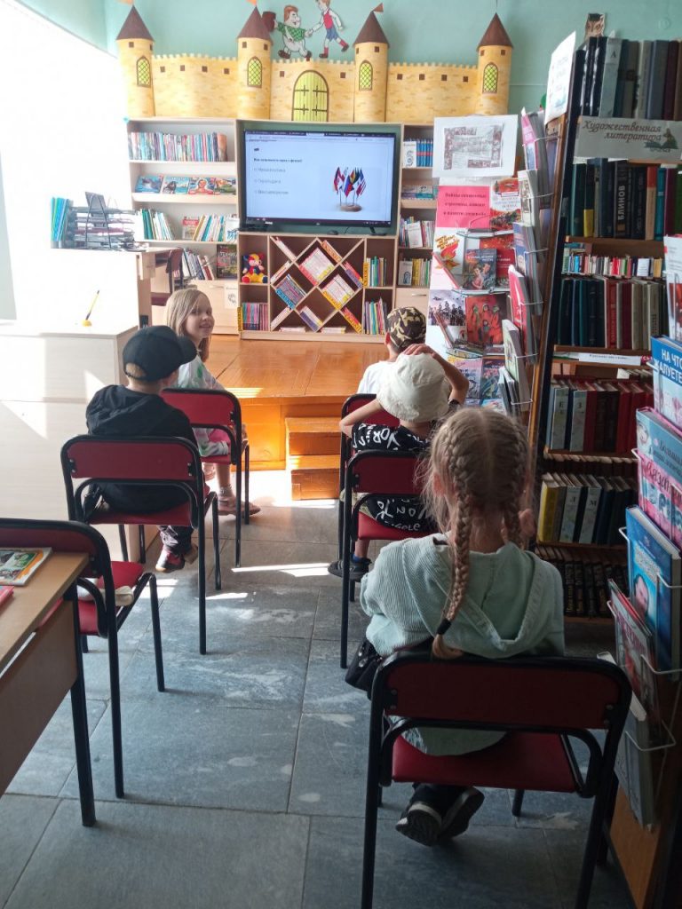Началось мероприятие с познавательной программы «Великий Российский прославленный флаг». Что мы знаем о флаге? Что он собой представляет? Когда он появился? Для чего он нужен? Ответы на эти вопросы участники мероприятия узнали из книги «С чего начинается Родина?», видеоролика «История российского флага», буклета «22 августа — День Государственного флага Российской Федерации». Важным элементом мероприятия стало исполнение государственного гимна.