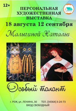 В арт-галерее Центральной библиотеки с 18 августа открыта выставка работ Малыгиной Натальи Александровны. Родилась она 12 февраля 1979 года в городе Реж. После окончания средней школы закончила Режевской сельскохозяйственный техникум по специальности менеджер. В 1999 году она вышла замуж, родила двоих замечательных детей.