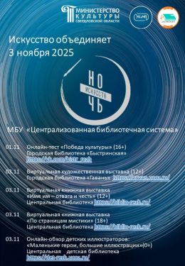 С 3 по 4 ноября 2025 года в Свердловской области проходит ежегодная всероссийская акция «Ночь искусств – 2025». Акция приурочена к празднованию Дня народного единства и проходит под девизом «Искусство объединяет».