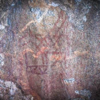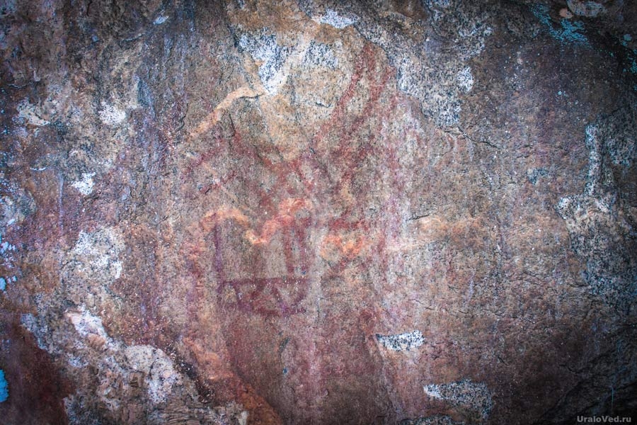 Позже здесь поселились древние люди, которые оставили после себя уникальные рисунки прямо у подножия скалы, названные учеными впоследствии «Шайтанской писаницей», открытой в 1976 году археологами В.Т. Петриным, А.Ф. Шориным и В.Н. Широковым. Состоит она из 17 групп рисунков (более 100 изображений), которые нарисованы на разной высоте. Интересный факт – некоторые рисунки расположены на высоте 15 см, а некоторые на высоте чуть выше 2 м земли. И так вопрос: как это можно было сделать, если перед скалой имеется отсыпь примерно в 5 м? То есть изображение на высоте 7 метров… любопытно… Самый знаменитый рисунок — это «Лось, попавший в сети» – так говорится во множестве источников, но не во всех. Среди всего разнообразия наскальных «картин» встречаются изображения человека, гуся или утки, лося или иного копытного, много графических знаков таких как ломаные линии, треугольники и прочее. Изучая рисунки, по отличиям в яркости и цвете (от красно-оранжевых до темно-бурых) ученые сделали вывод, что изображения создавались на протяжении длительного времени. Какие-то фигуры видны четко, другие же расплылись в пятна. Некоторые рисунки нанесены поверх более старых. На вершине скалы, на глубине около 2 – 2,5 м обнаружены стоянки человека – наконечники стрел и керамика. В книге «Уральские писаницы. Реки Реж и Ирбит» В. Н. Широкова (2007 год) есть цитата, которая не дает нам точной датировки происхождения как находок в культурном слое почвы, так и самих рисунков: «…Наиболее вероятно, что находки разновременны. Характер обнаруженных остатков определить достаточно сложно, так как для этого мало информации. Пожалуй, лишь топография находок дает некоторые основания для их отнесения к категории жертвенных. С другой стороны, в шурфе не найдены ни костные остатки, ни угли, которые в большинстве случаев сопровождают жертвенный материал. Так что атрибуция находок, а также какая-либо их связь с наскальными рисунками проблематична. Не дают они оснований и для датировки материала…» (Широков, Чаиркин, 1990 год).