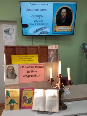 В рамках юбилея М.Е. Салтыкова-Щедрина в Арамашковской сельской библиотеке прошел День писателя «Золотое перо сатиры». Наши читатели знакомились с книжной выставкой «Я люблю Россию до боли сердечной…». Представленные книги, рассказывающие о жизненном и творческом пути писателя, а также его произведения, имеющиеся в библиотеке, вызвали интерес у читателей. Весь день в библиотеке демонстрировалась презентация «Салтыков-Щедрин чиновник и сказочник», которая знакомила посетителей библиотеки с фактами биографии писателя. Звучал рассказ о его детстве, о годах учебы, о службе, которая дала ему столько материала для его острых произведений, и, конечно же, о том, как он стал тем самым «писателем мудрых сказок», чьи произведения до сих пор заставляют нас смеяться и задумываться. Посетители библиотеки с удовольствием вспоминали сказку о безответственном и всего боящемся обитателе речных глубин Пескаре и отвечали на вопросы викторины.
